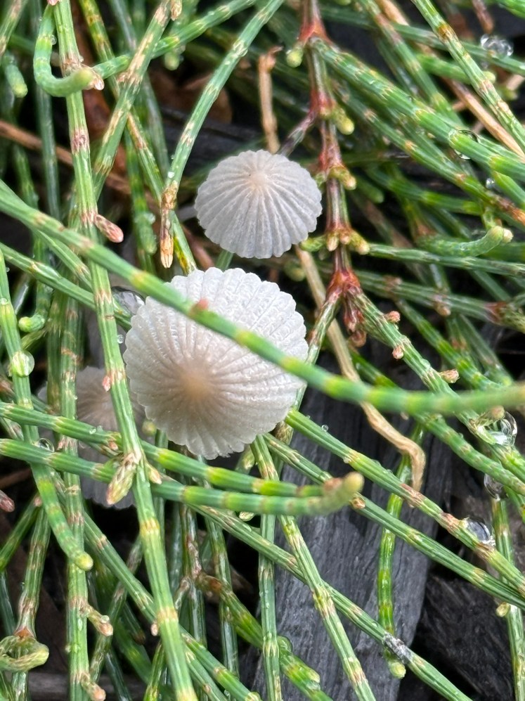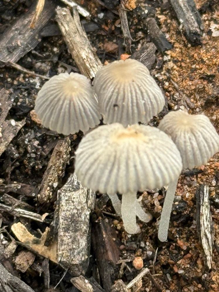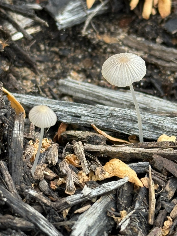 I was working in the garden, fixing a cut in the reticulation, when I noticed something unexpected at my feet — these tiny, beautiful mushrooms quietly growing in the mulch.